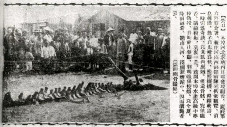 1934年8月8日午后,辽河北岸东小街一农民在附近苇塘发现一巨大水族动物。该物长约10米,头部左右各一角,长约1米余。脊骨共29节,非鱼非鲸,体已腐烂。伪营口第六警察署将其运至西海关附近空地陈列数日,一时轰动全城,参观者络绎不绝。后该遗骨运至县立师范作教学标本。当年8月17日的《盛京时报》记载:“<龙骨由县发给师校作为标本>本埠河北苇塘日前发现龙骨,由警察第六分署载来市内西海关前陈列,供众参观。旋经省立高级中学校渔捞科教授张君判明,确系蛟类,浅搁于泥土之上而涸毙者等情,已志本报。兹该蛟骨已由县警务局呈交县署教育局,拟于日内发给通惠门街县立师范南校,作为动物标本,以为研究生理学之材料云”。